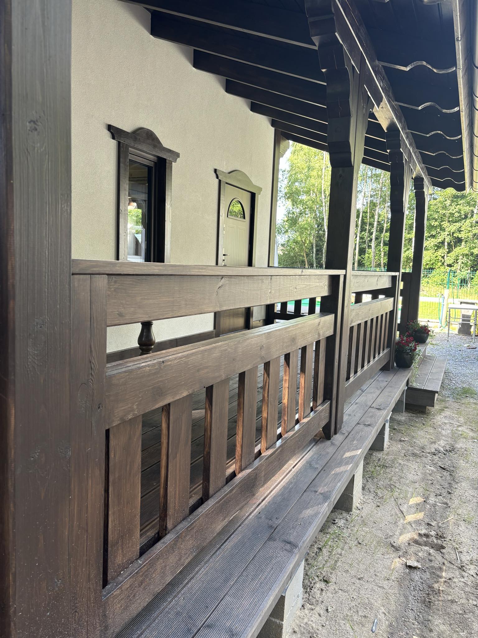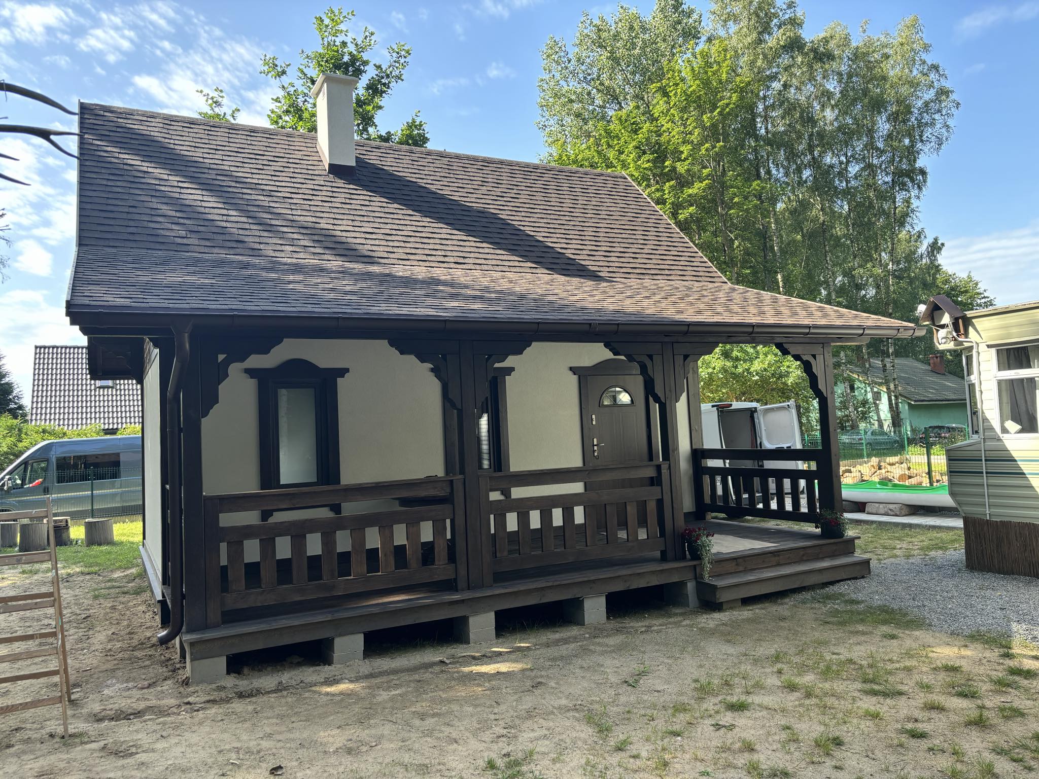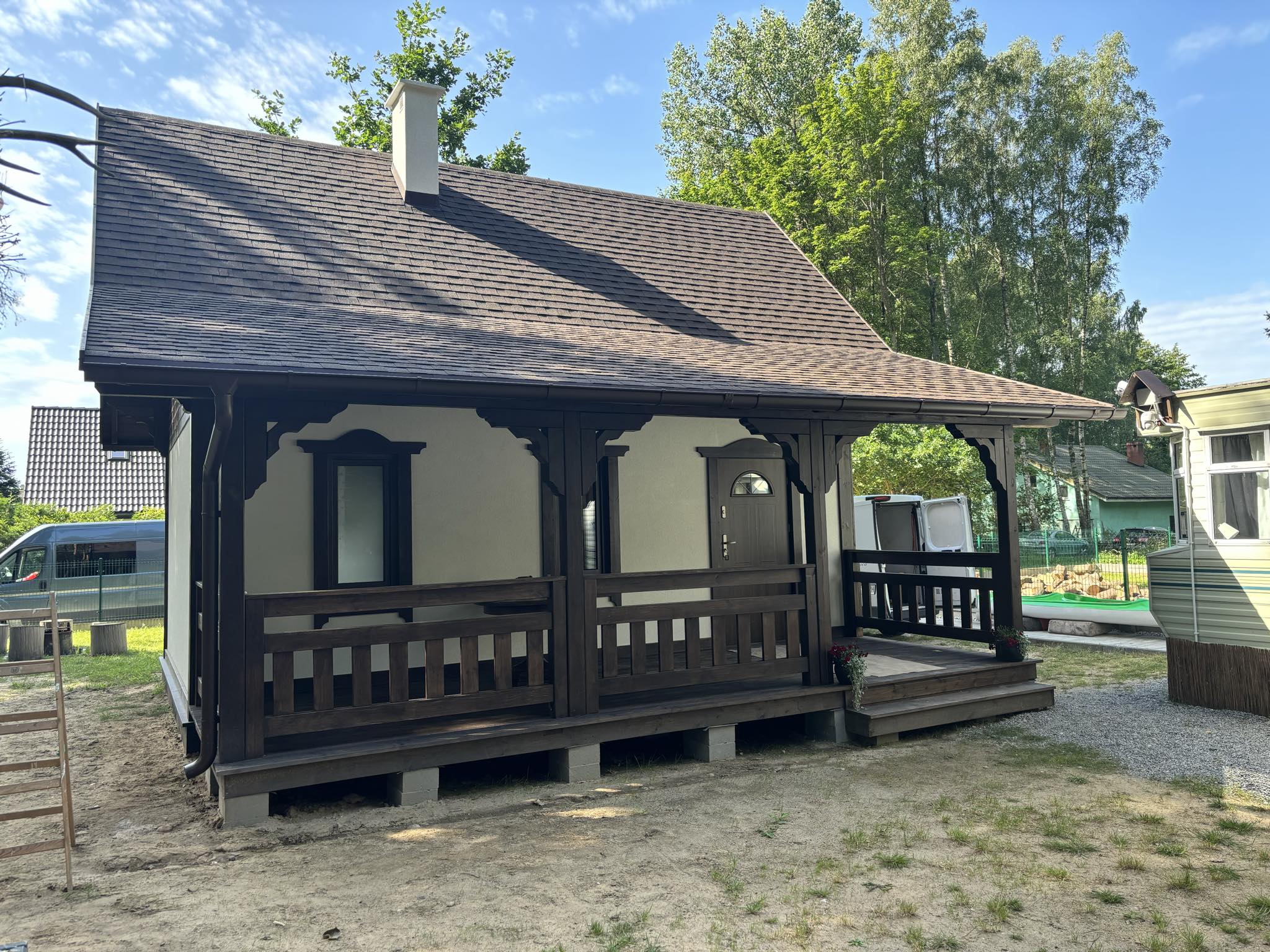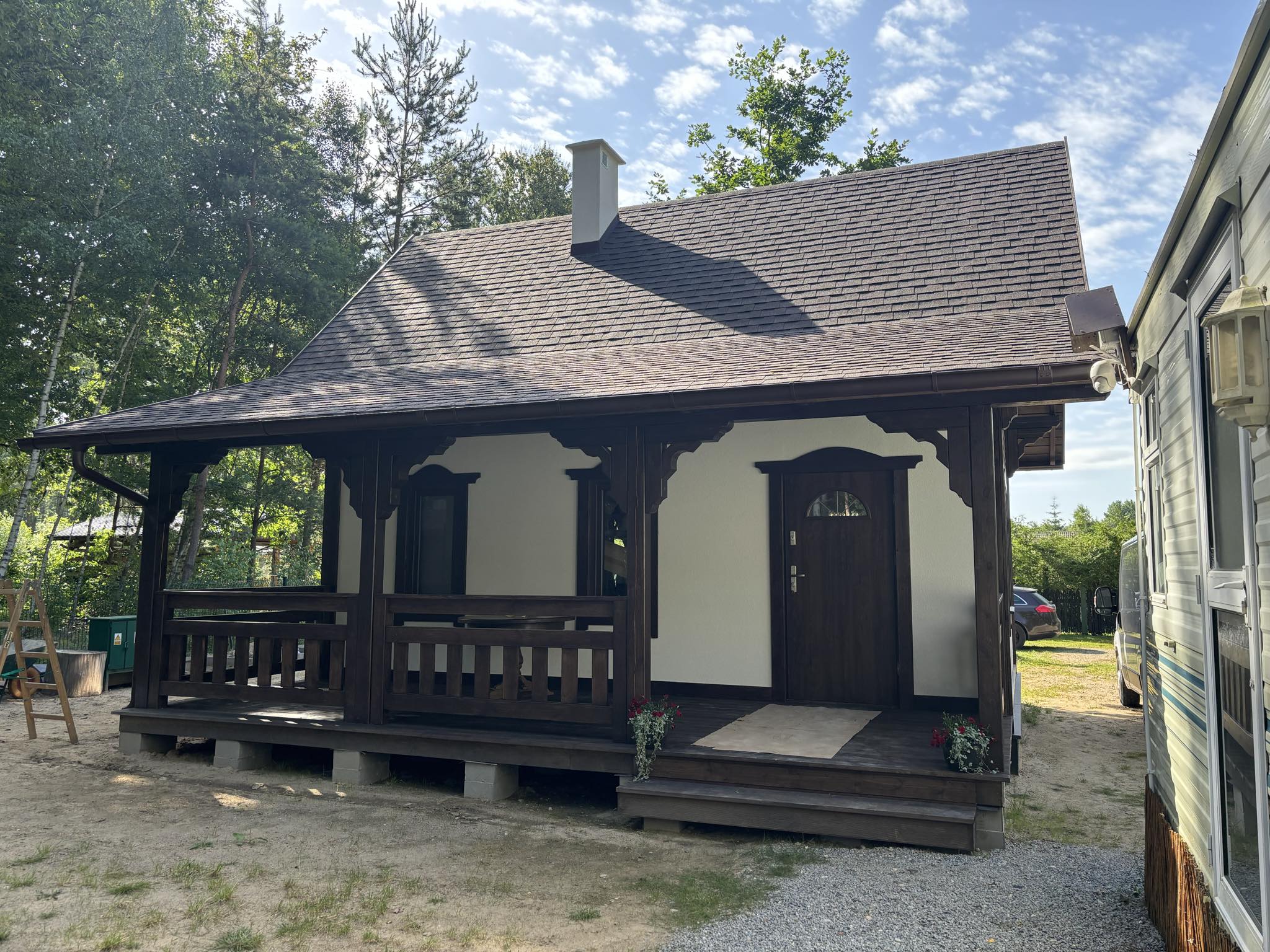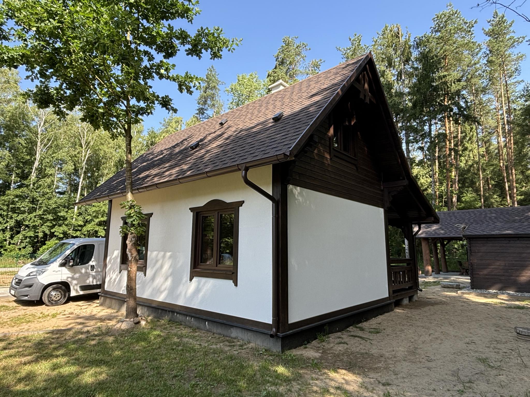 W cenie piękne ozdoby drewniane, lukarna, przestronny taras idealny na wieczorny relaks i odpoczynek na łonie natury.