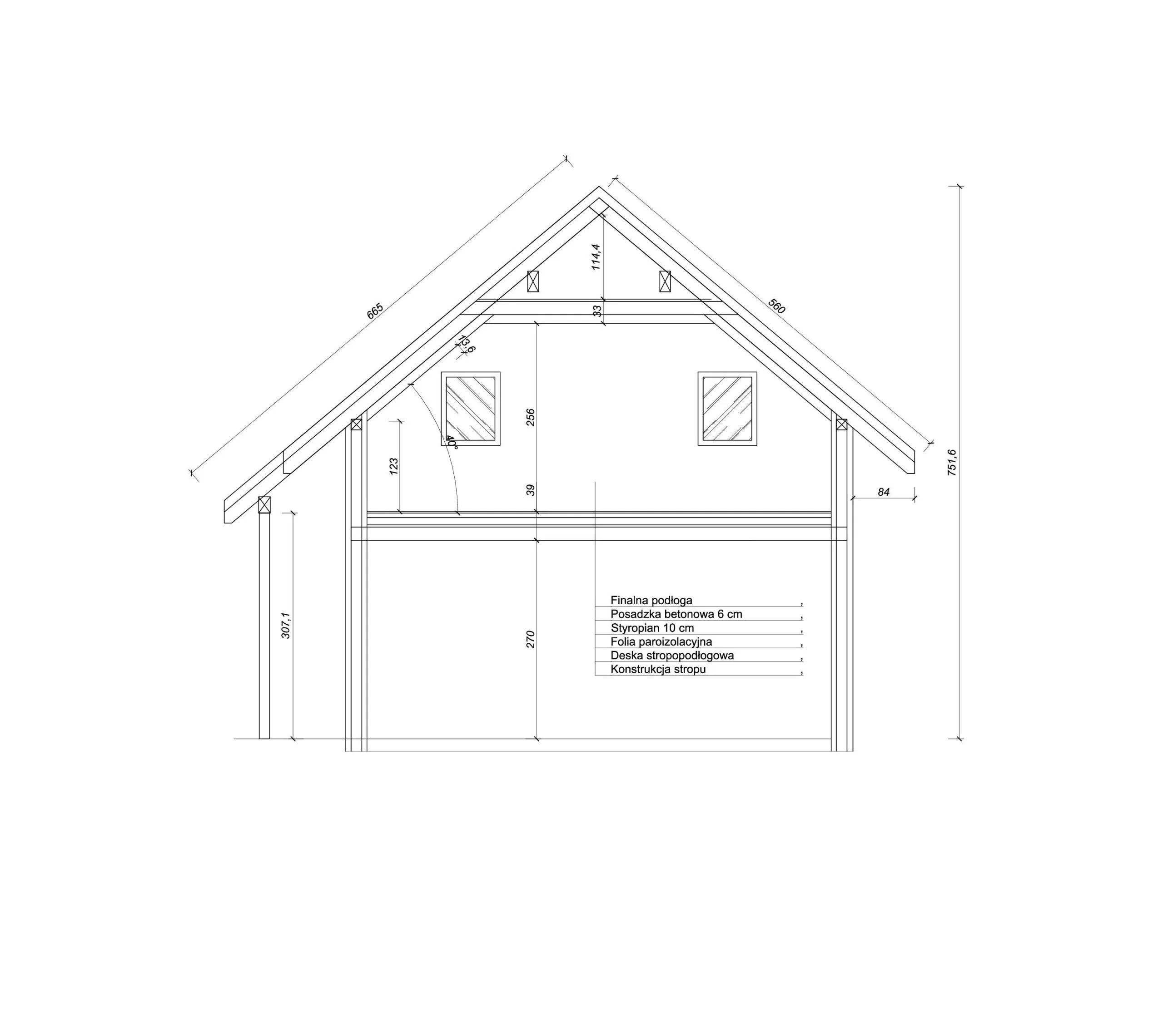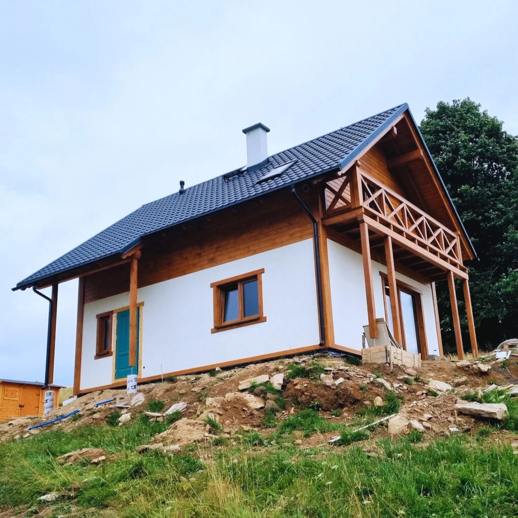 Dom jest bardzo ładny, przestronny z wysoką ścianą kolankową, bo aż 1,08 m, dach o kącie nachylenia 40 stopni oraz wysokości budynku 7,83 m.