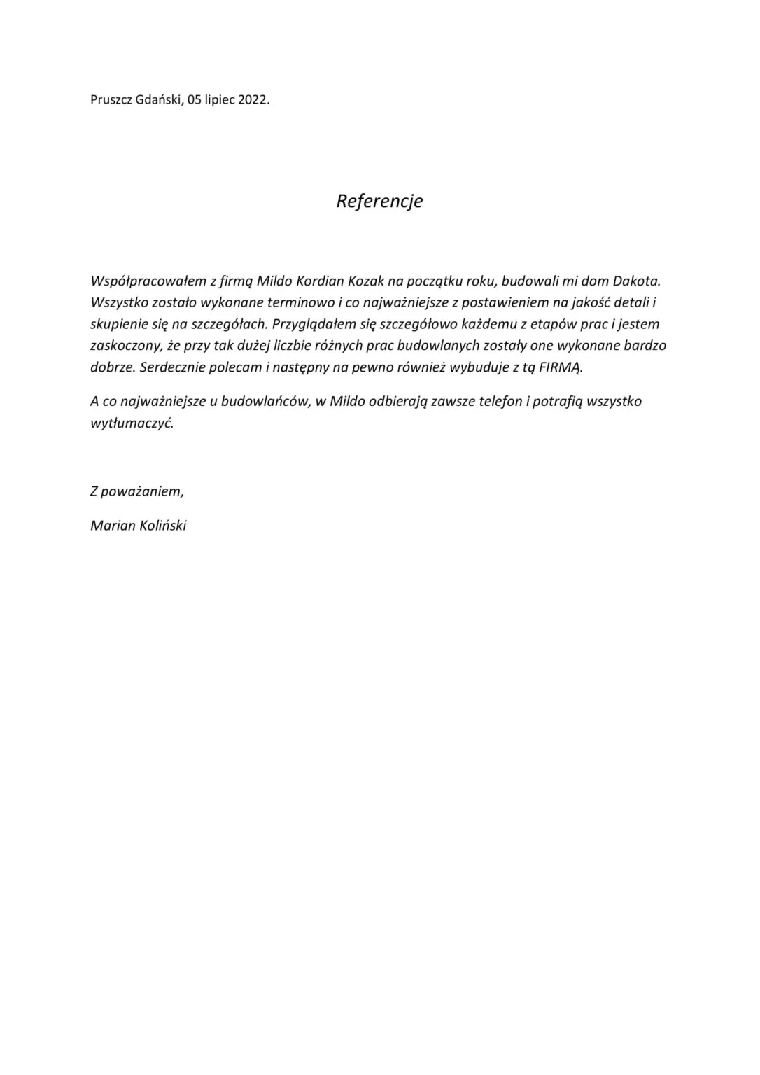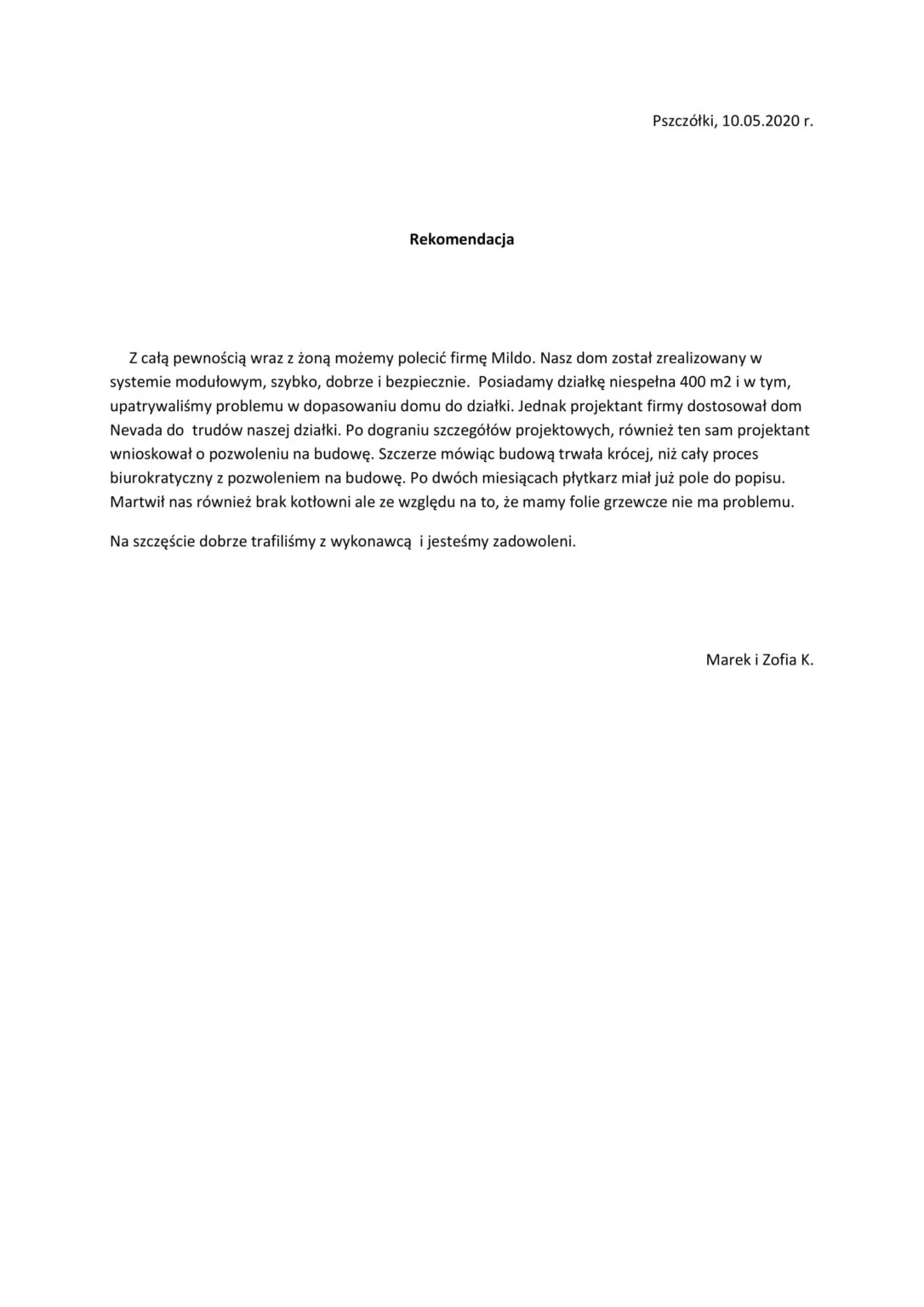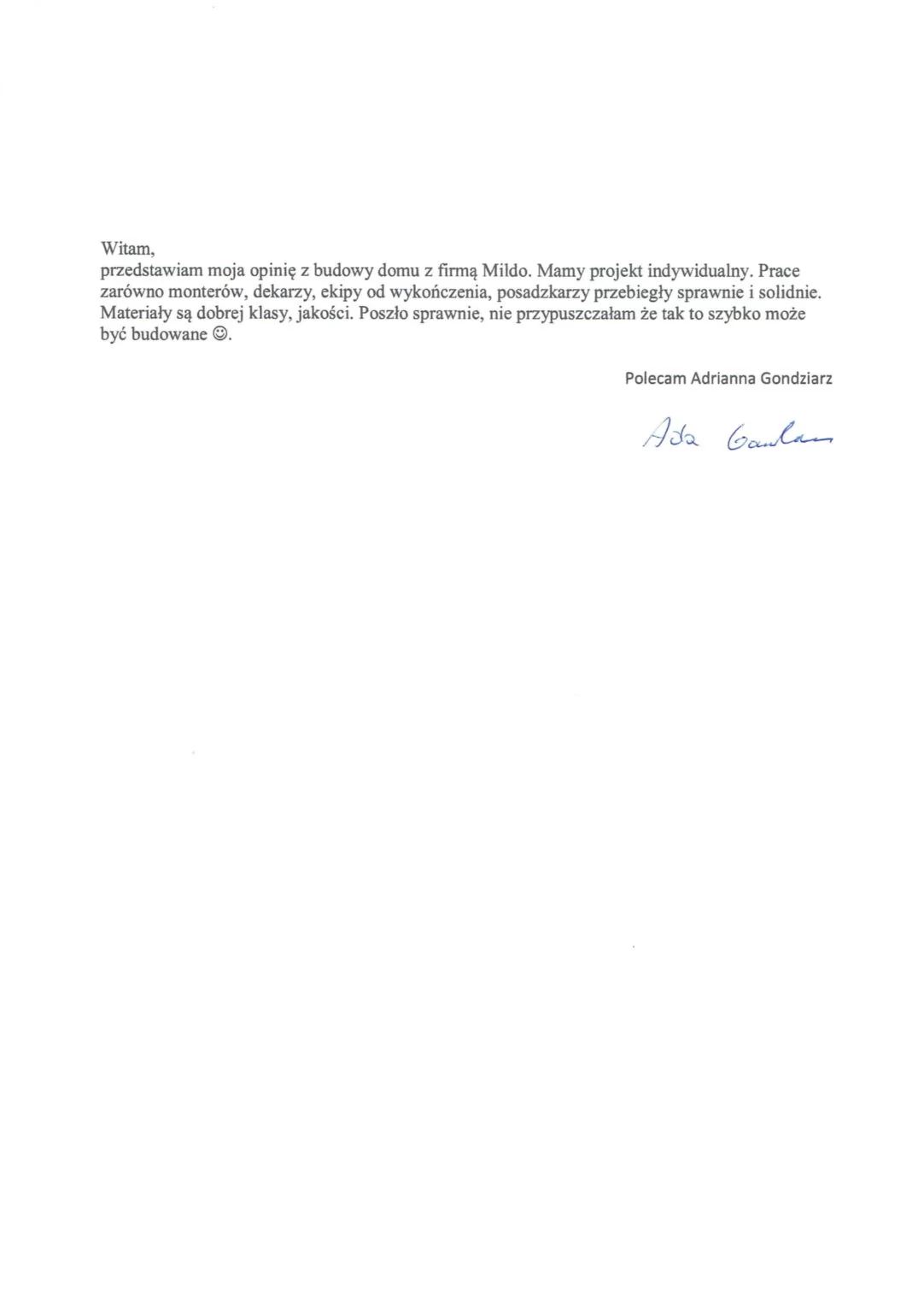 Gorąco polecam firmę Mildo. Właśnie została ukończona budowa projektu Karolina i jesteśmy bardzo zadowoleni z każdego etapu budowy i wykończenia domu do stanu deweloperskiego. Dziękujemy za zaangażowanie całej firmie w szczególności właścicielowi – Pan Kordian monitorował na bieżącą każdy etap i był z nami w stałym w kontakcie.