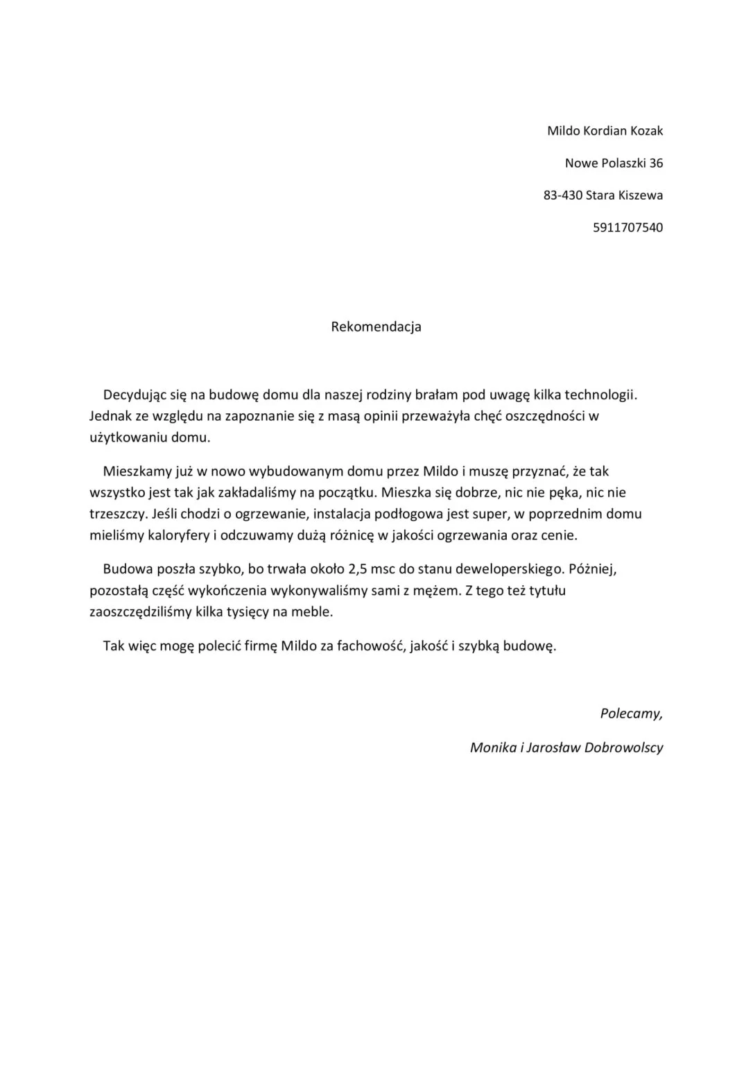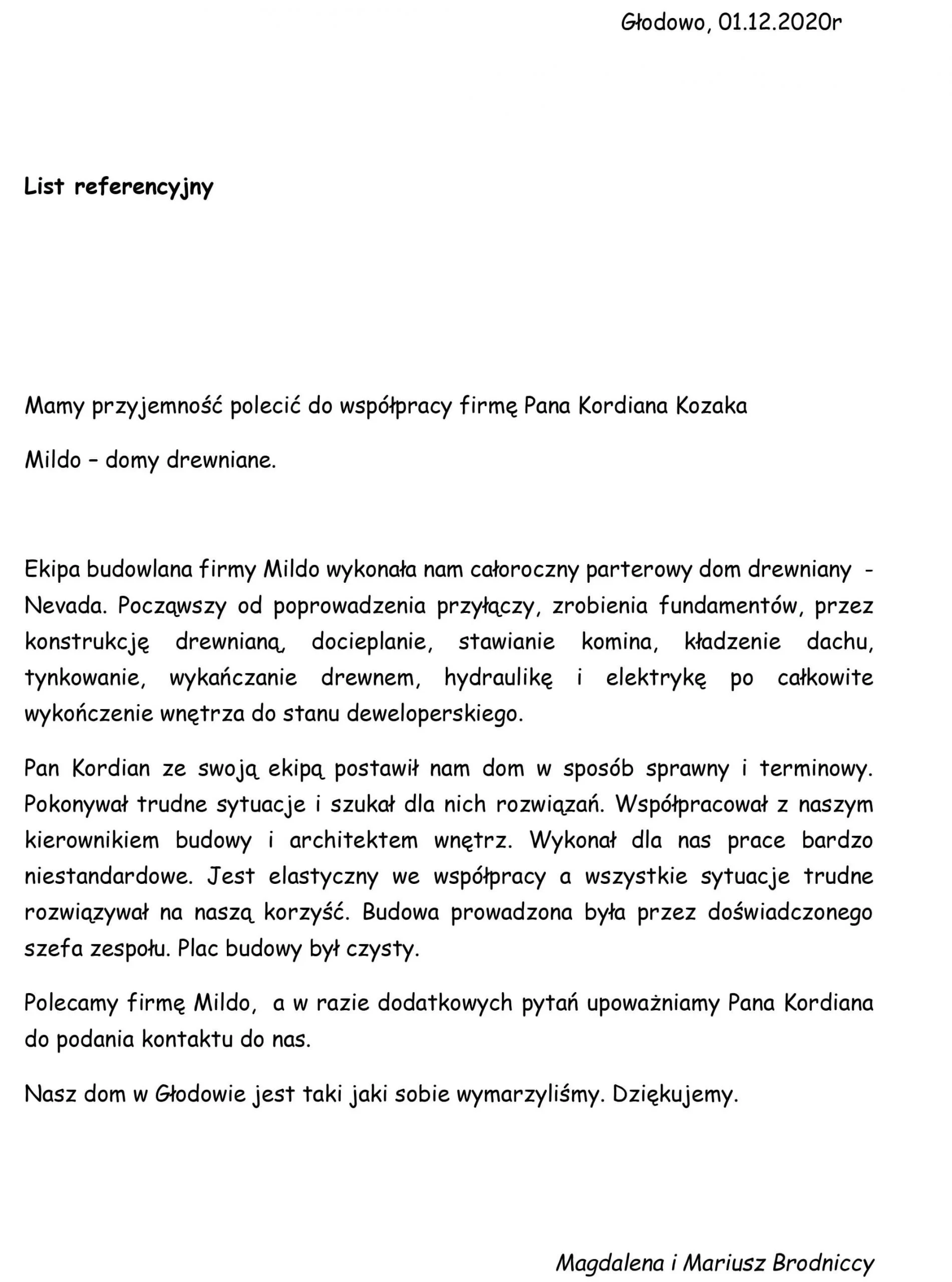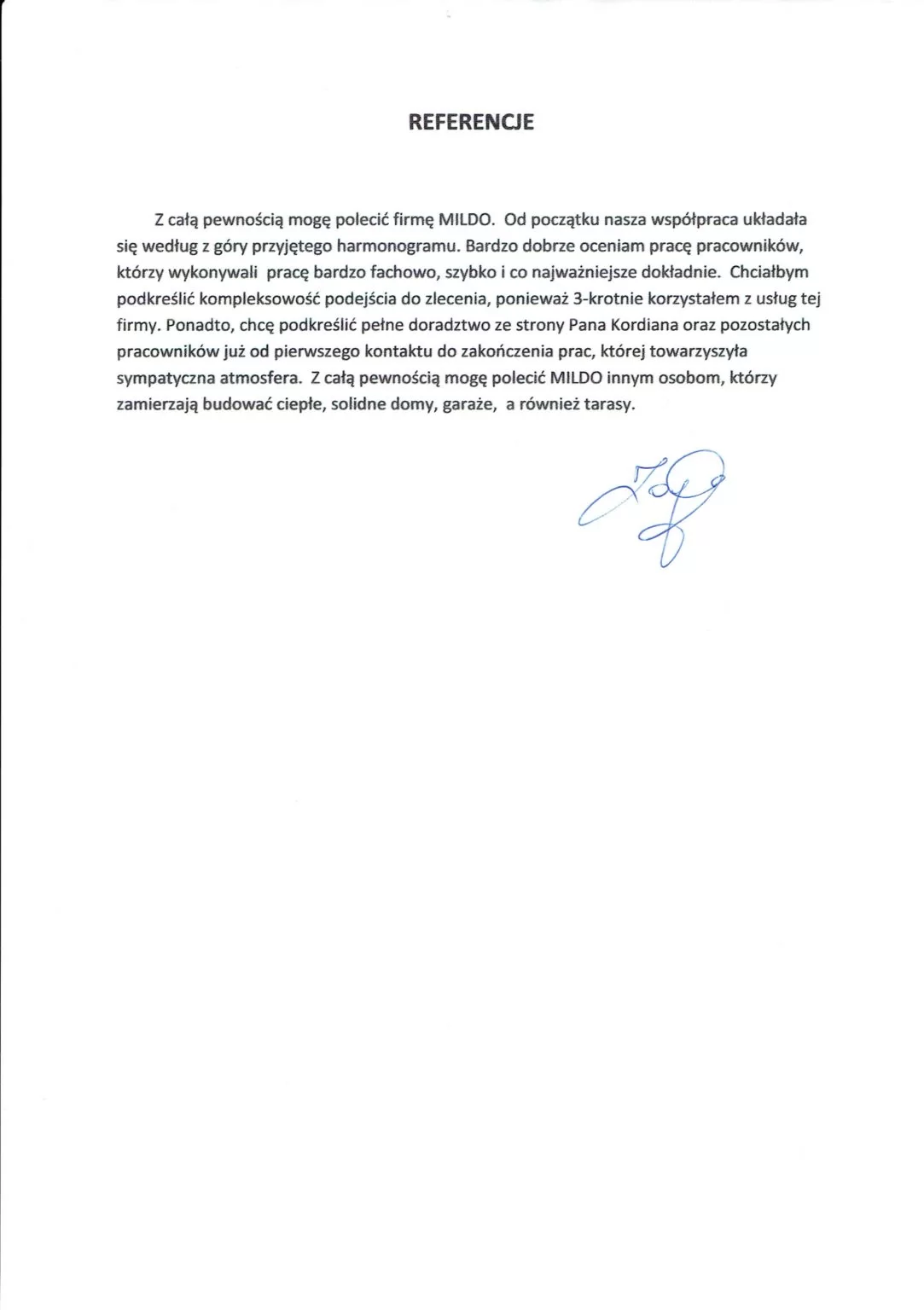 Gorąco polecam firmę Mildo. Właśnie została ukończona budowa projektu Karolina i jesteśmy bardzo zadowoleni z każdego etapu budowy i wykończenia domu do stanu deweloperskiego. Dziękujemy za zaangażowanie całej firmie w szczególności właścicielowi – Pan Kordian monitorował na bieżącą każdy etap i był z nami w stałym w kontakcie.